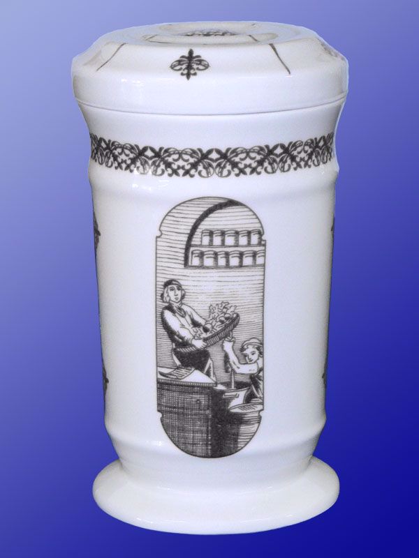 Porcelán dísztégely gyógynövényes, patikai jelenetekkel metszetes formában, arany motívumokkal. H-21 cm d- 9 cm